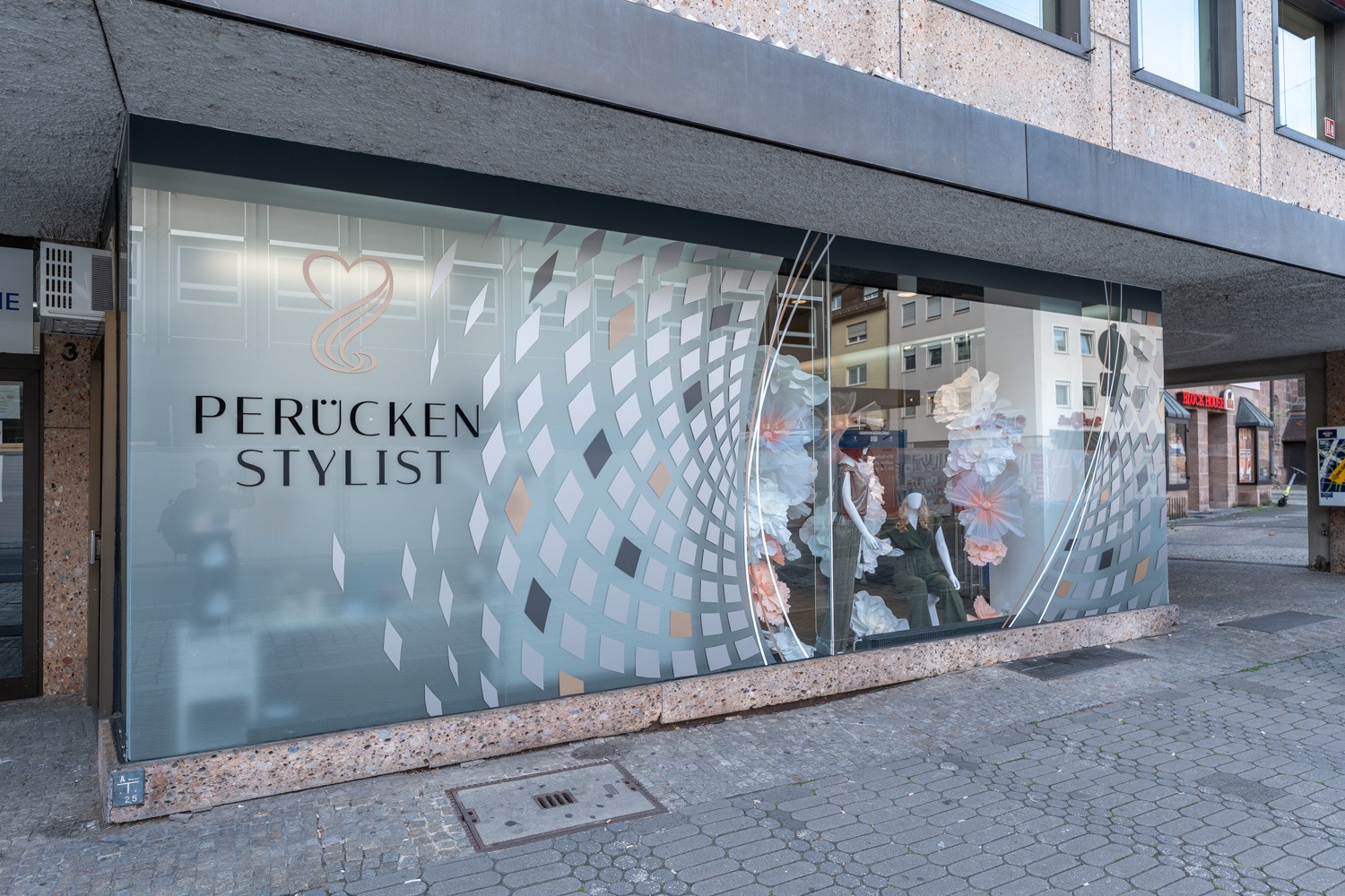 Schaufensterbeschriftung für Perückenliebe in Nürnberg. Die Beschriftung besteht aus einem eleganten Folienplot, der in Silber, Messing und Milchglasfolie gestaltet ist. Dadurch entsteht ein modernes und ansprechendes Design, das die Aufmerksamkeit der Passanten auf sich zieht und das Geschäft stilvoll präsentiert.